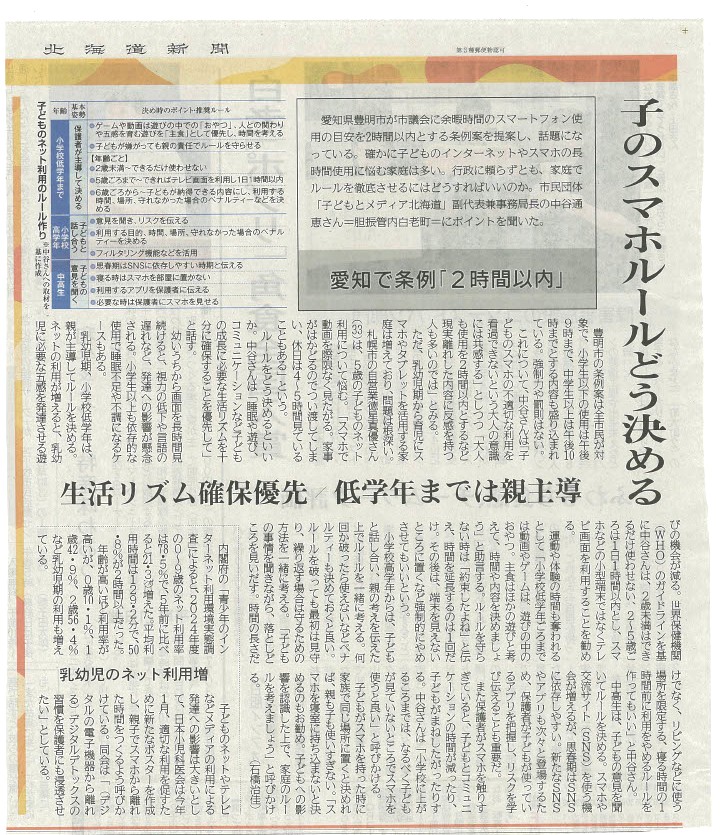 9月中旬に、記者さんから取材についてのお問合せがありました。白老までいらして2時間以上話を聞いてくれました。その後も何回も確認してくれて、限られた紙面で「子どもの発達段階で、大人の側がルール作りの方法を変える」という、私の最も伝えたかった部分をまとめて下さり感謝です。