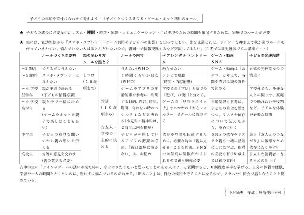 今回、このような機会をいただけたことで、あらためて「年齢や特性に合わせたルール作り」について、資料を作成しました。この表を参考にして、新聞の表を作成して下さいました。